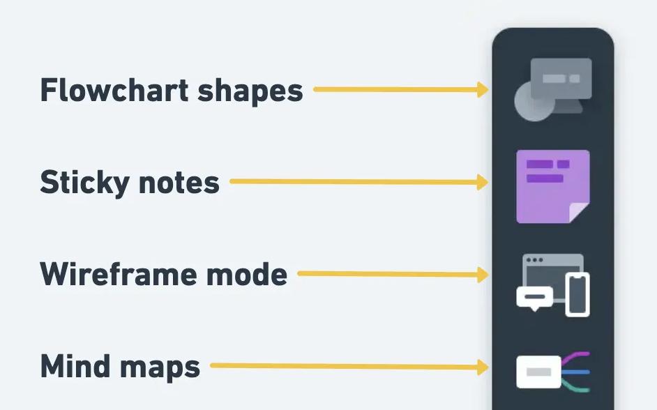 No matter what you want to add to your boards, the toolbar is where you'll find it. The most important elements, as well as a specific mode for wireframes, are in the top section: